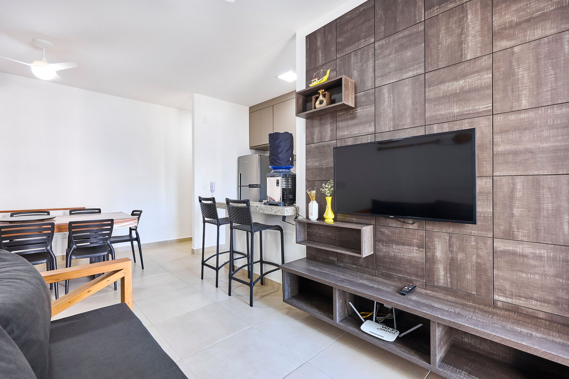 - Living room with TV and sofa bed, ceiling fan