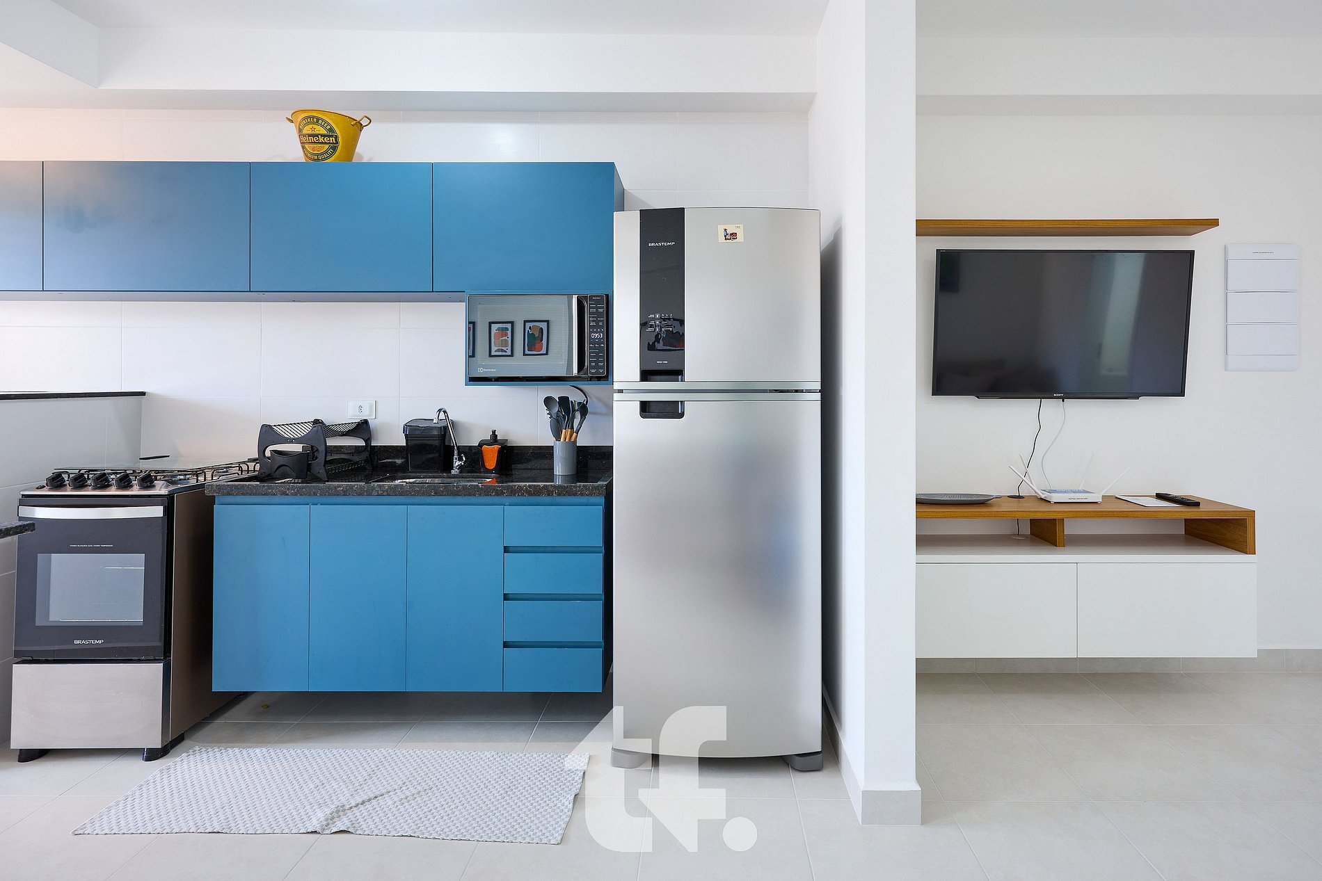 Cozinha Planejada: Moderna e totalmente equipada com eletrodomésticos de alta qualidade, como microondas, geladeira e fogão, além de eletroportáteis essenciais como liquidificador, Air fryer Electrolux 4.6L e cafeteira.