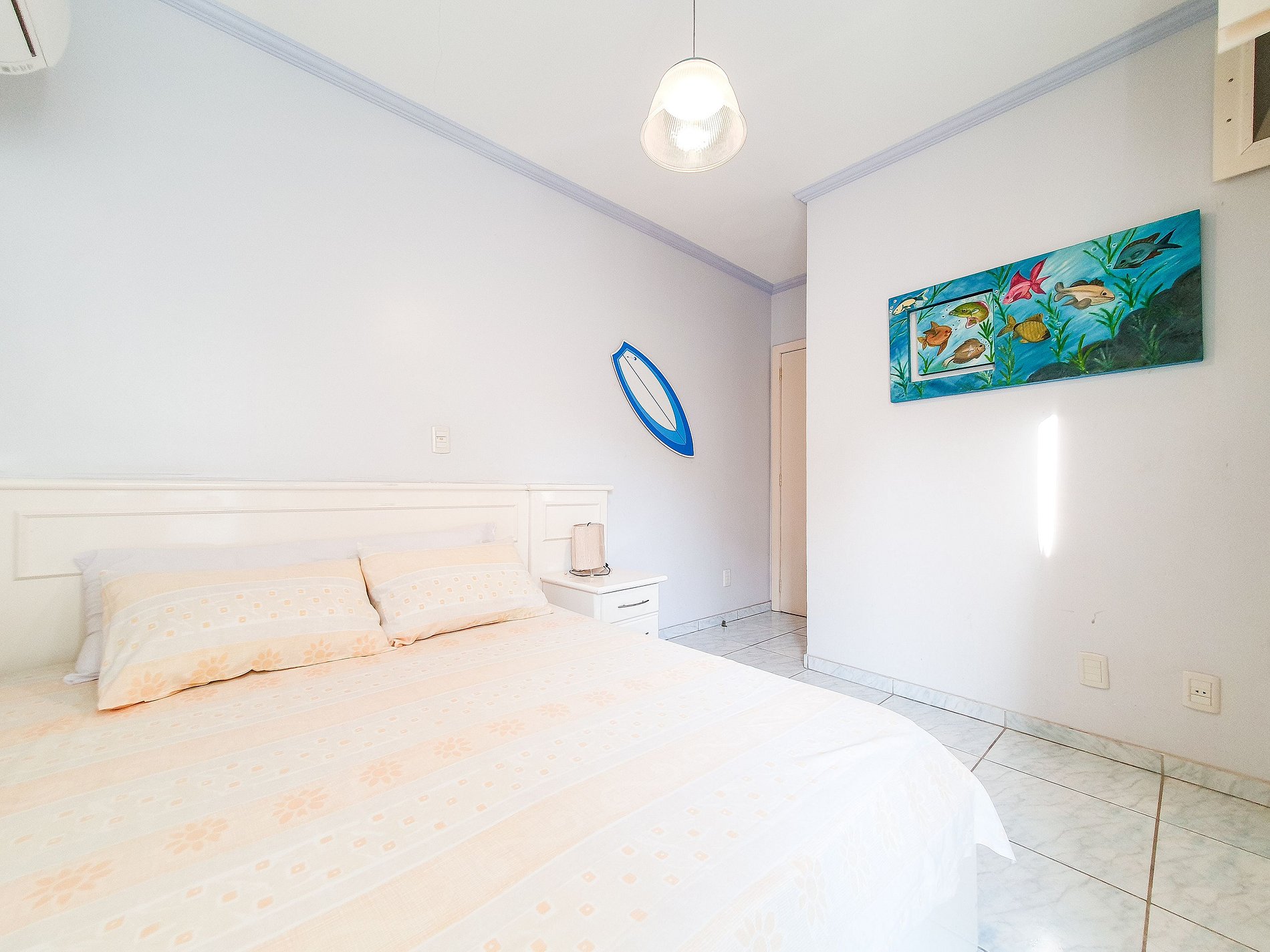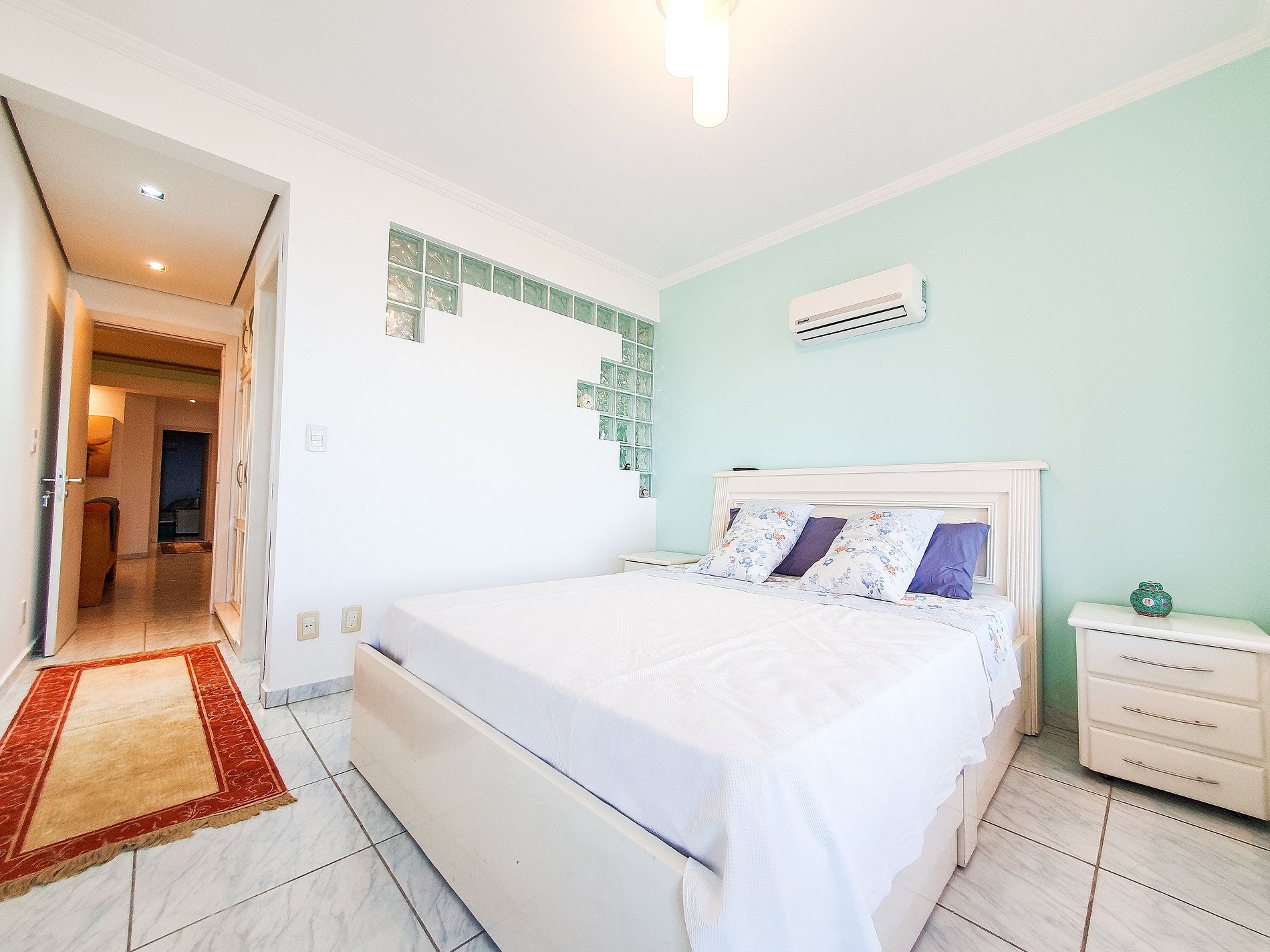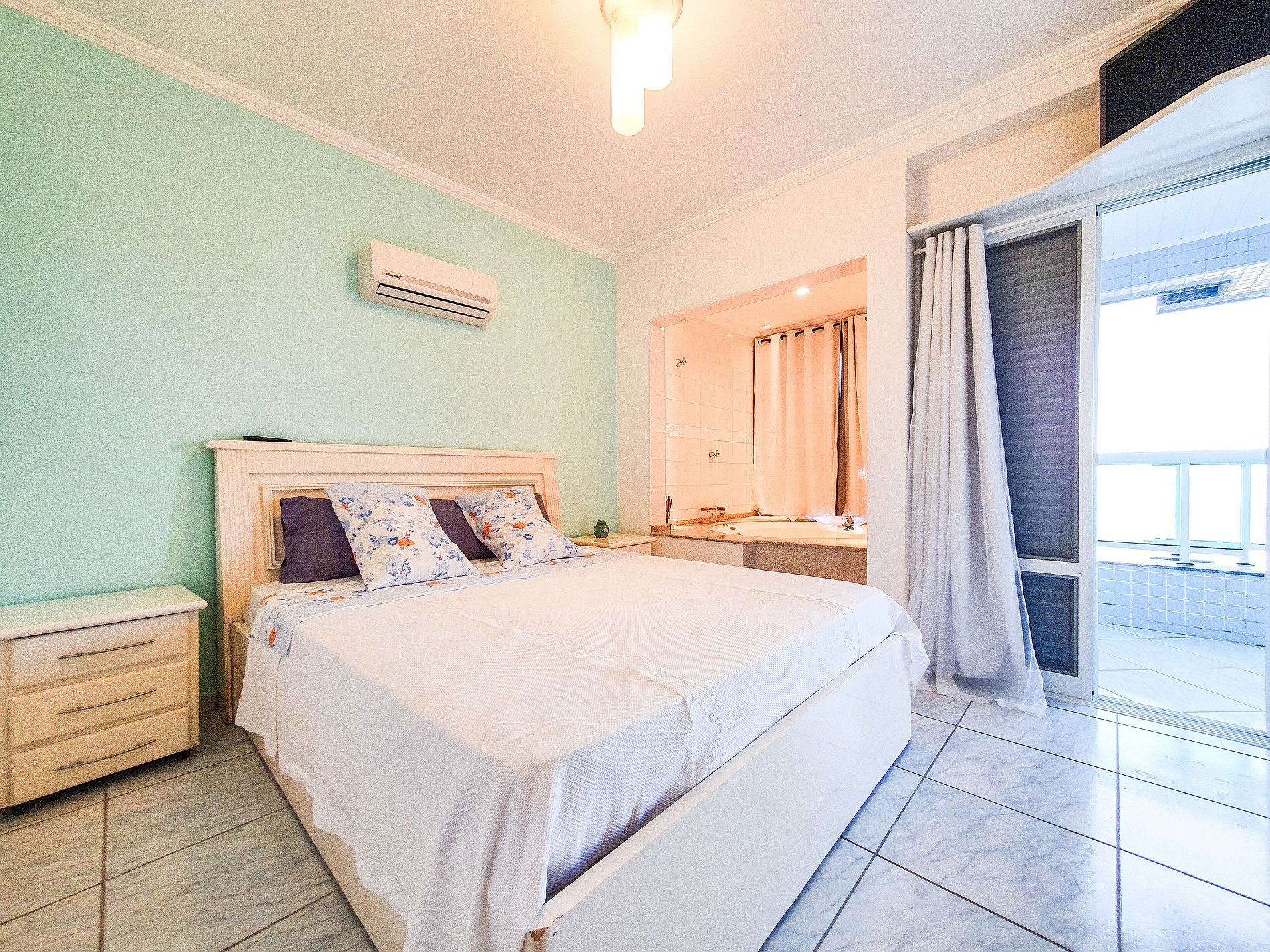 - Suíte 1: cama de casal, ar condicionado, guarda-roupa, TV, banheiro com hidro e vista para o mar