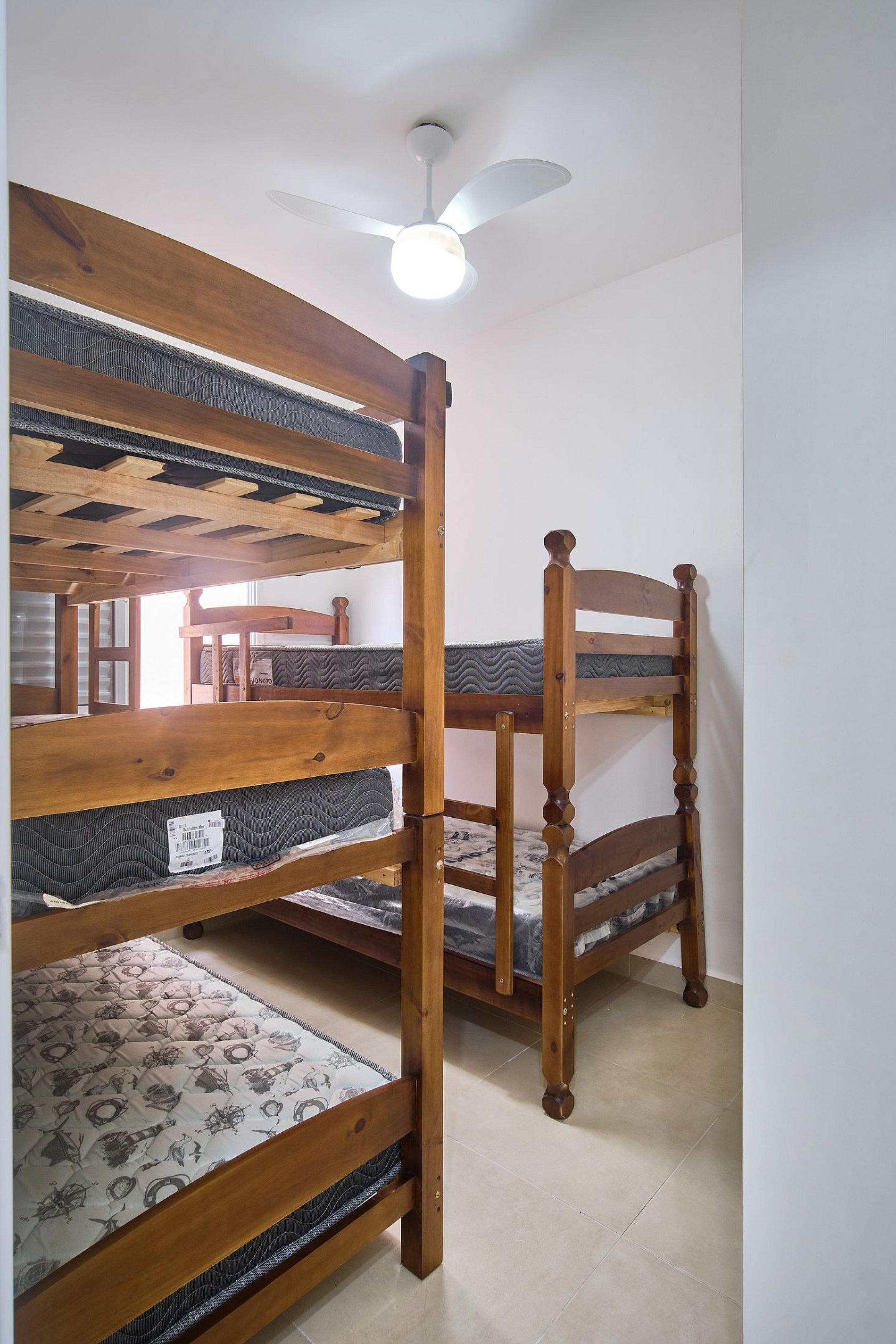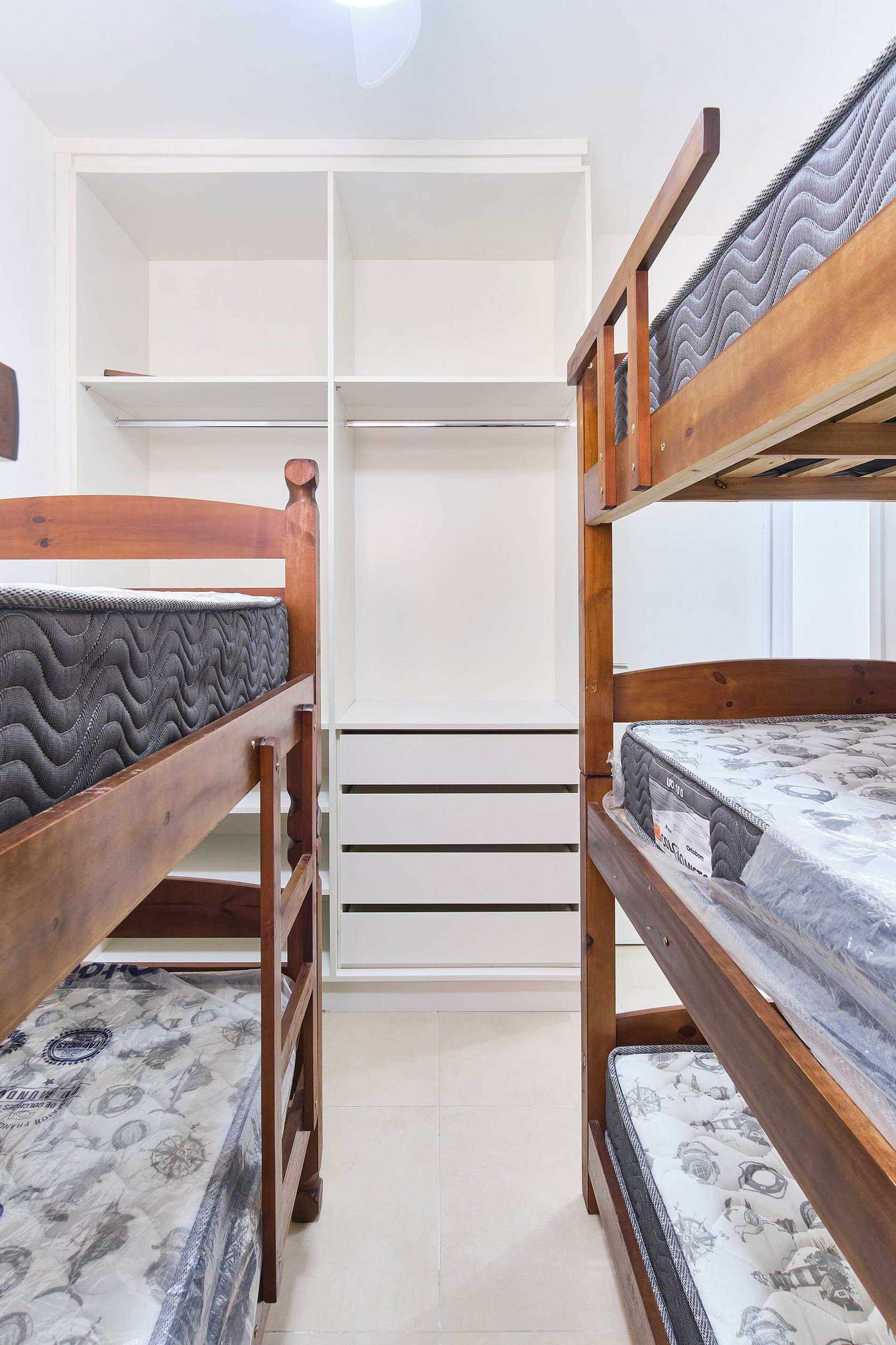 - 2 dormitórios com ar condicionado: - Suíte com cama de casal, guarda-roupa, ventilador de teto - Dormitório com 2 beliches, guarda-roupa, ventilador de teto