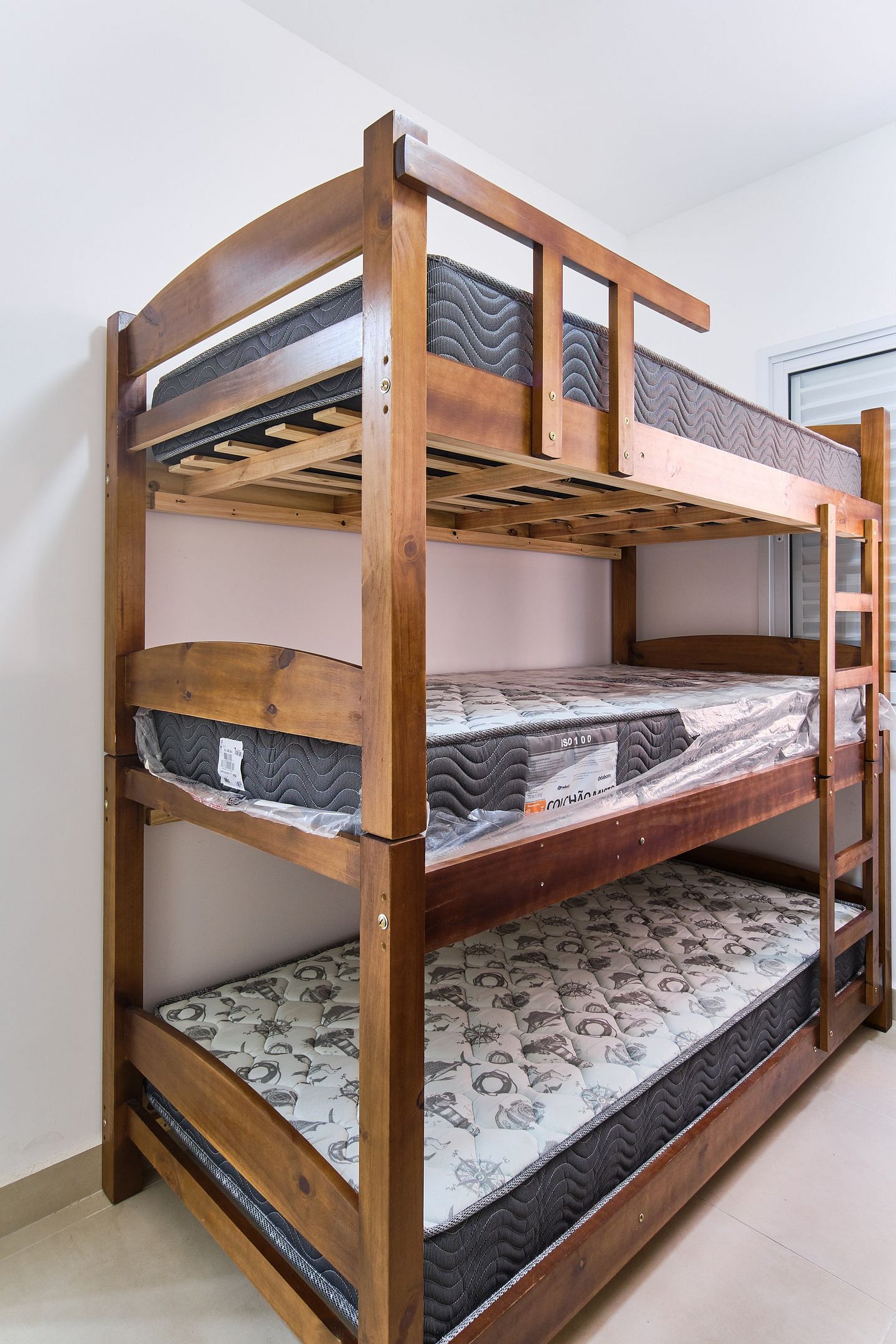 Quarto que tem beliches não tem telinha na janela, as beliches ficam encostadas na janela até porque o espaço é pequeno e não tem jeito de ser de outra forma, porém com criança o risco de acidente aumenta, esse quarto seria melhor aproveitado se não tivesse 2 beliches sendo 3 camas cada, o motivo é que o quarto fica muito apertado, a primeira cama da beliche é quase impossível dormir de tão apertado e a última no alto corre o risco de alguém bater no ventilador já que fica na mesma altura. Sugestão seria retirar as beliches, deixar somente 2 camas de solteiro e os colchões, assim o quarto ficaria com mais espaço e aconchegante para dormir. Falta telinha na sacada também.