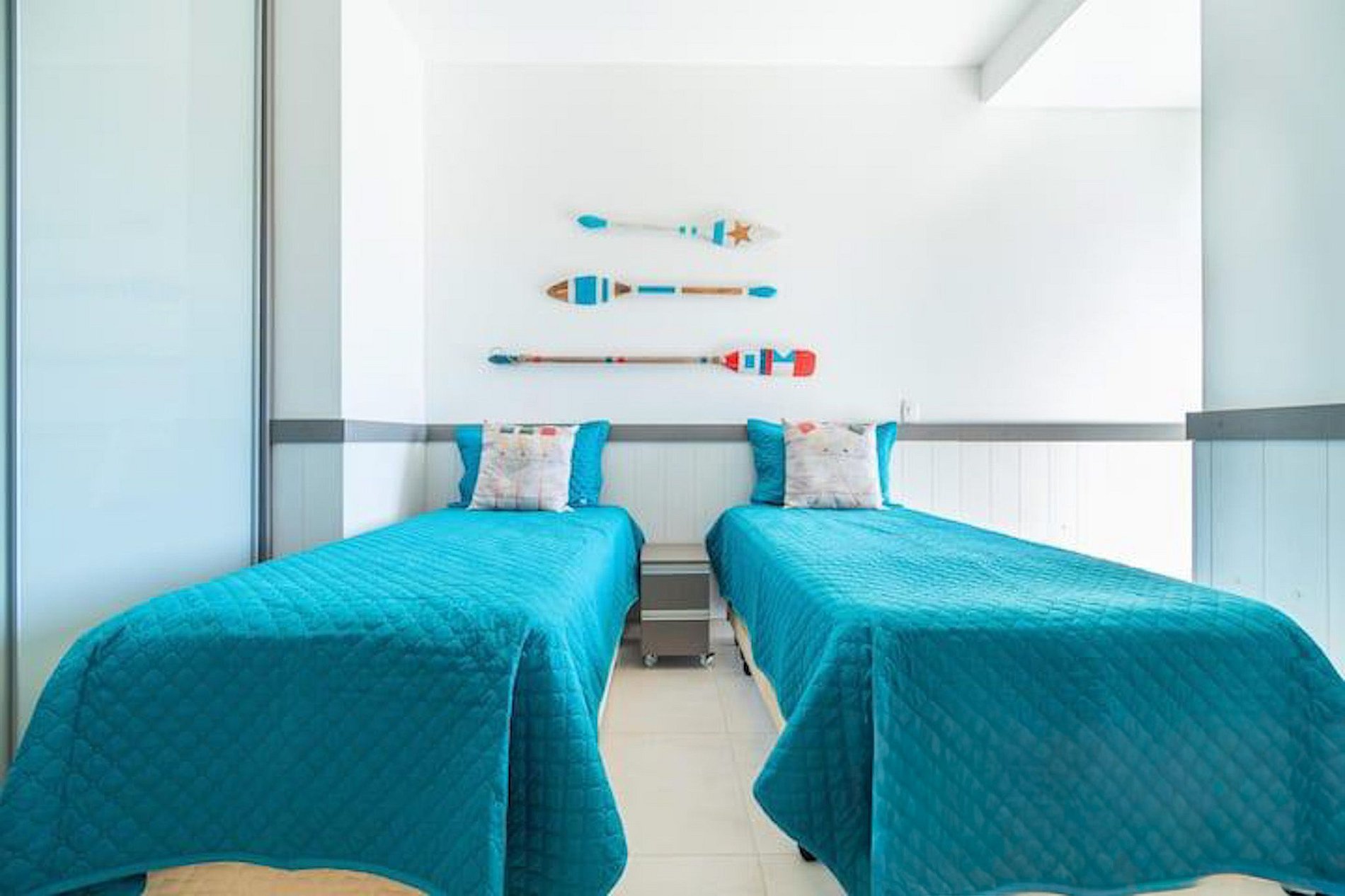 Na suíte possui 1º suíte possui uma cama de casal, ar condicionado, guarda roupas planejado; na 2º suíte possui uma cama de casal, ar condicionado, guarda roupas planejado e na 3º suíte possui 2 camas de solteiro, ar condicionado, guarda roupas planejado.