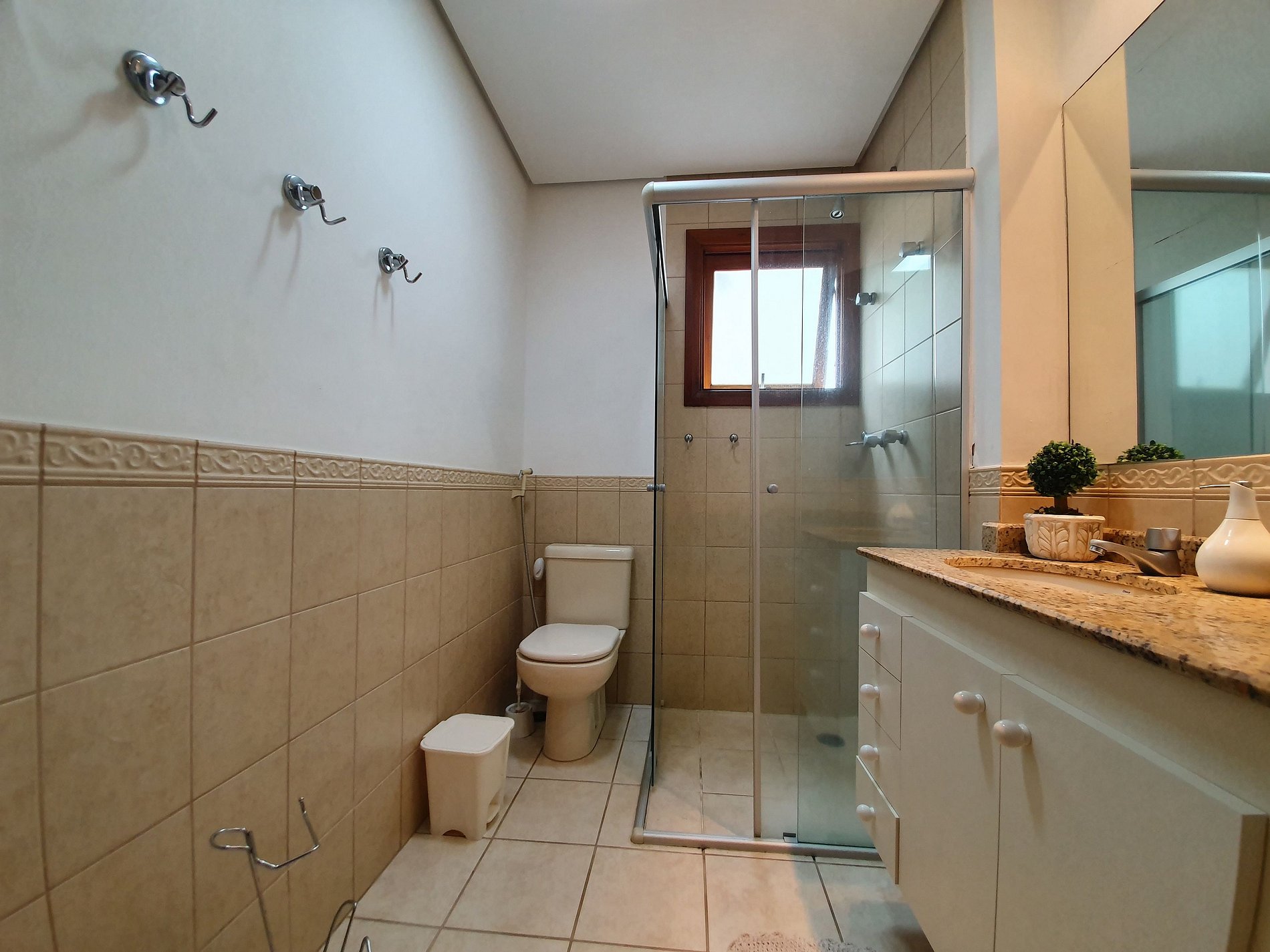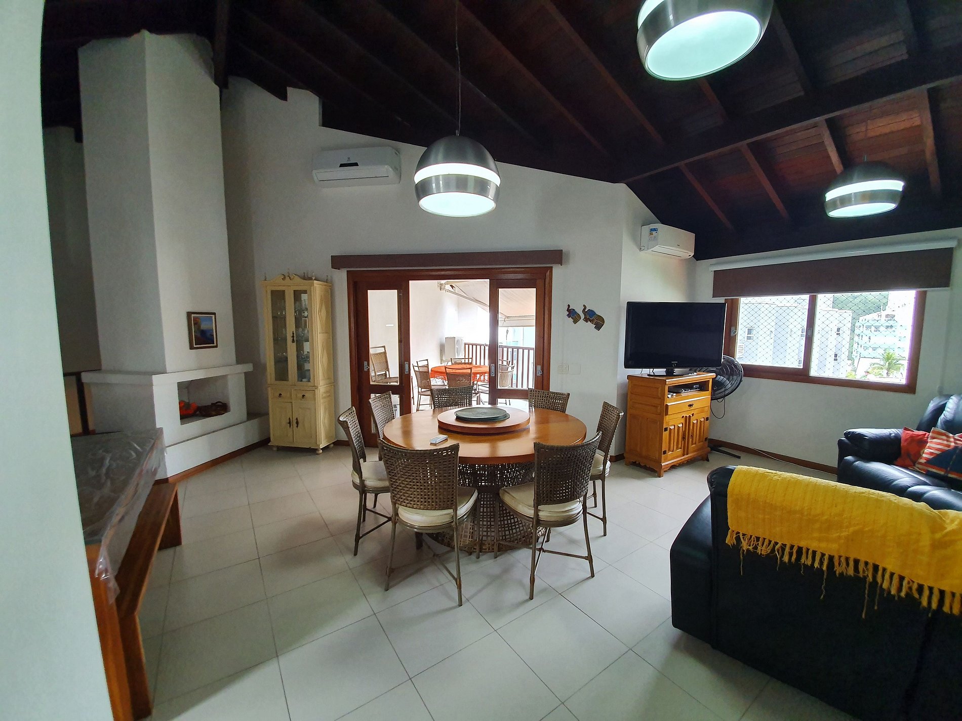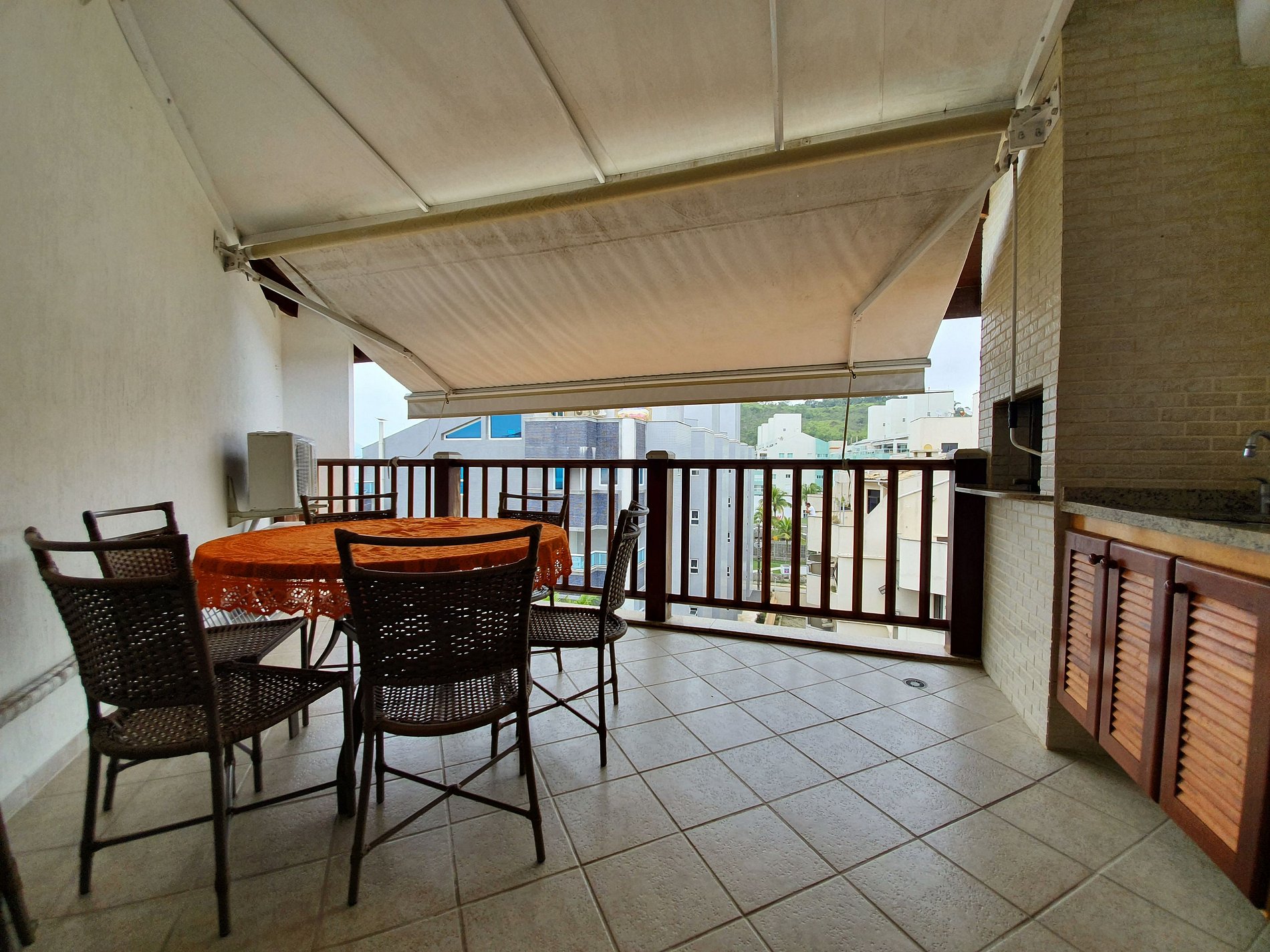 No andar superior há uma área integrada com cozinha americana com cooktop, forno elétrico com e grill, lavadora de louça, geladeira duplex, bebedouro de água, micro-ondas e todos eletrodomésticos, sala de tv, sala de jantar com ar condicionado, banheiro social, varanda gourmet com churrasqueira e vista para o mar.