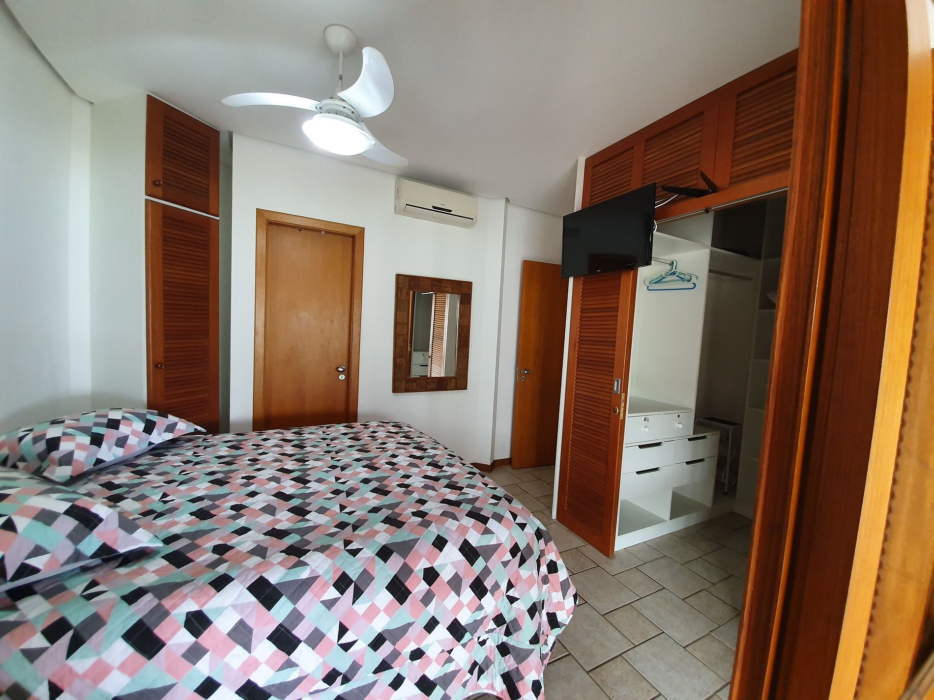 Na 1º Suíte com cama box queen casal, Tv led 32", ar condicionado e varanda; no 1º dormitório com uma cama box casal e uma cama box de solteiro, ar condicionado e varanda; e no 2º dormitório com cama casal e 1 cama box de solteiro, TV 40” e ar condicionado.