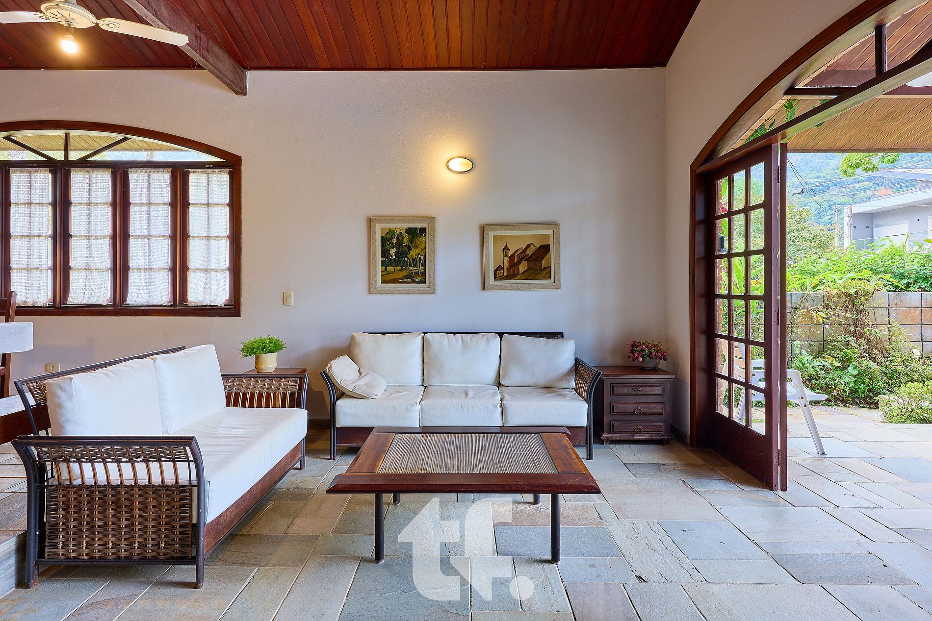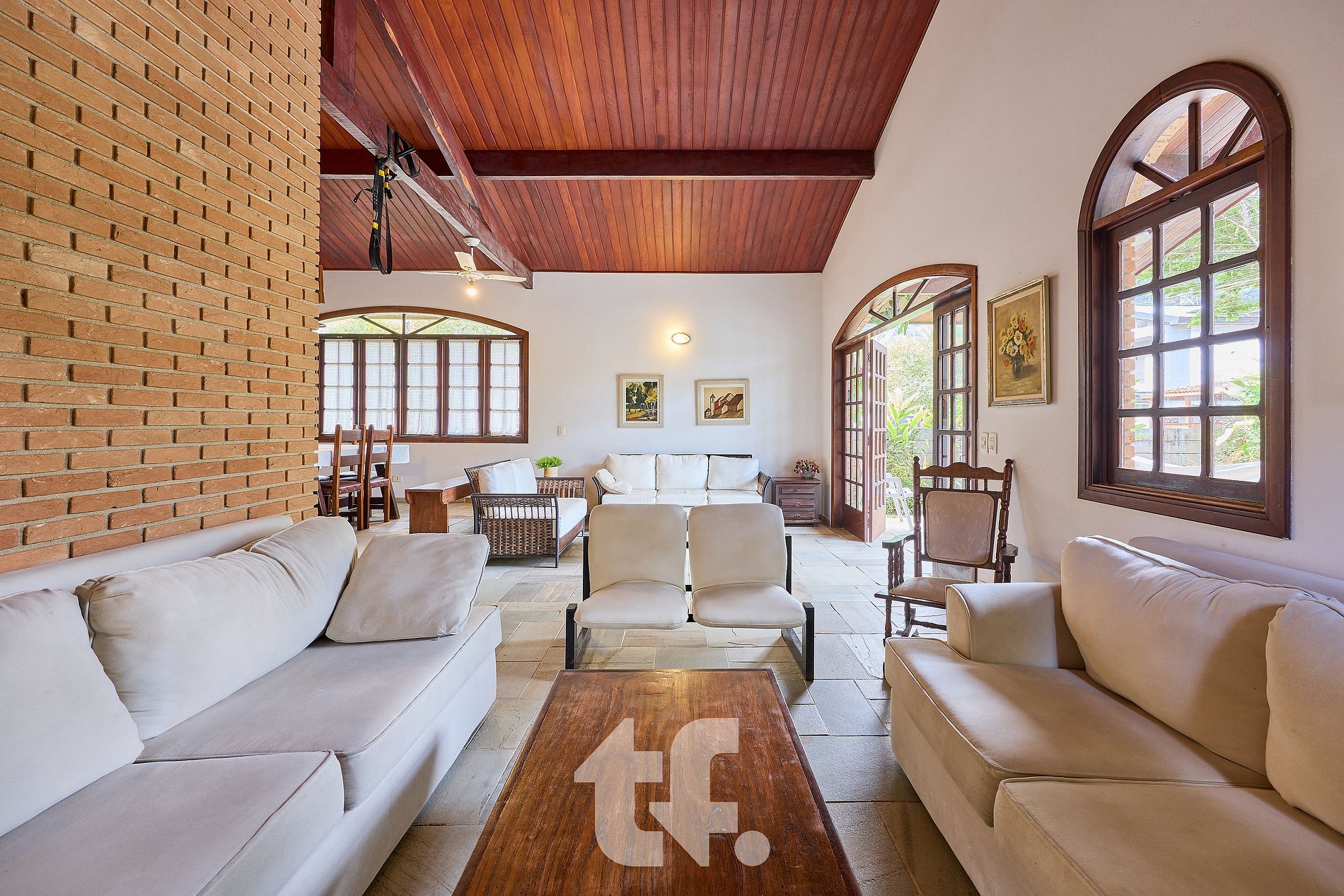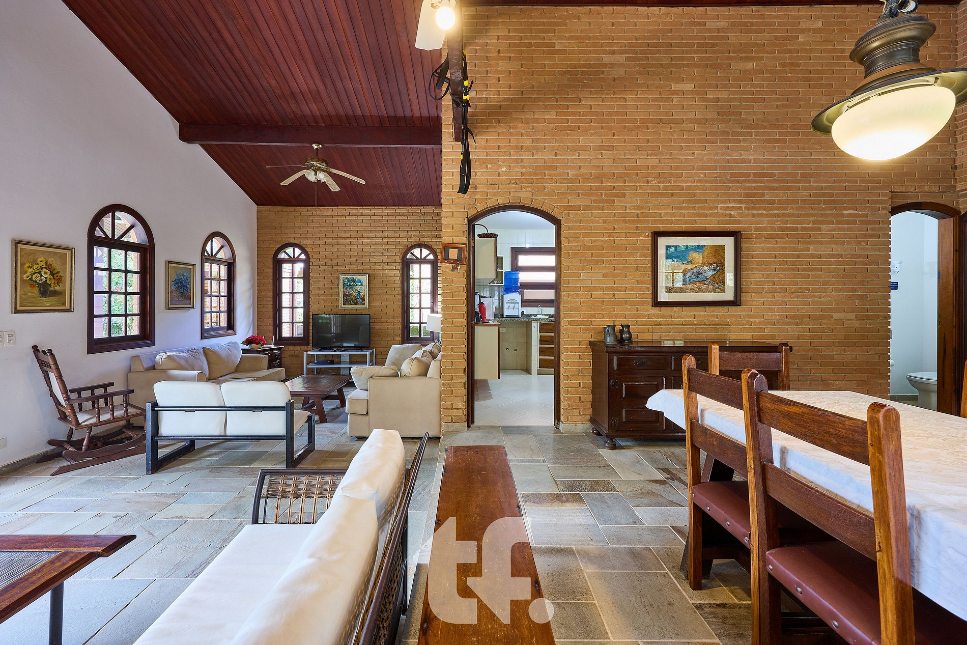 – Ampla sala de estar com TV e ventiladores de teto